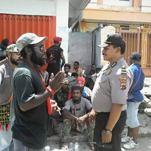 | Ketua KNPB Numbay, Calvin Wenda saat melakukan negosiasi dengan aparat saat dihadang sebelum dibawa ke Polresta Jayapura. (Foto: Suarapapua.com) |